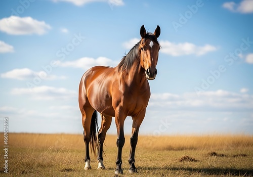 A magnificent brown horse stands proudly in a golden field under a vibrant blue sky.
