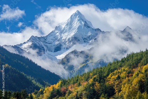 A magnificent snow-capped mountain stands tall in the distance, surrounded by lush green forests and colorful autumn leaves