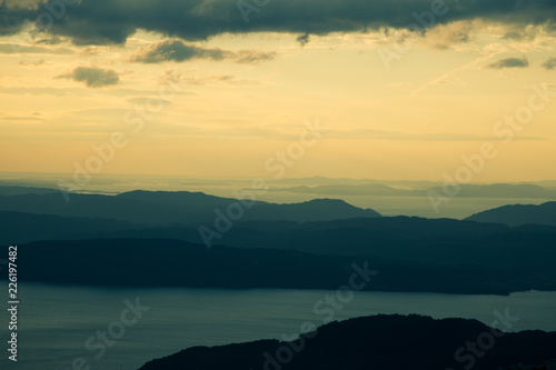 A magnificent sunset scenery over the fjords in Norway. A beautiful autumn landscape in Folgefonna national park. Dramatic sky and mountains.