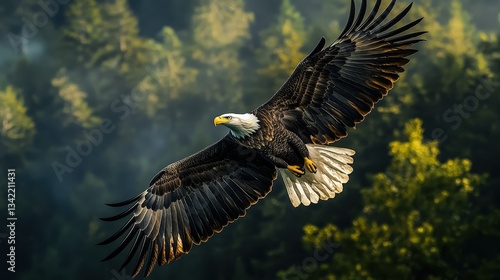 A majestic bald eagle soaring high above the forest, its wings spread wide as the pristine golden sunset light bathes everything in an ethereal glow.