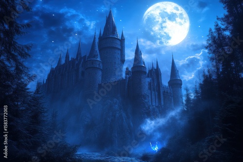 A majestic castle under a bright full moon surrounded by dark trees and a mystical atmosphere