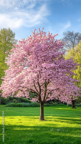 A majestic cherry tree bursts with vibrant pink blossoms under the bright blue sky