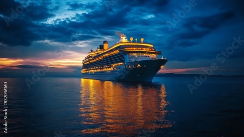 A Majestic Cruise Ship Gracefully Sailing into a Colorful Sunset Over Peaceful, Calm Waters
