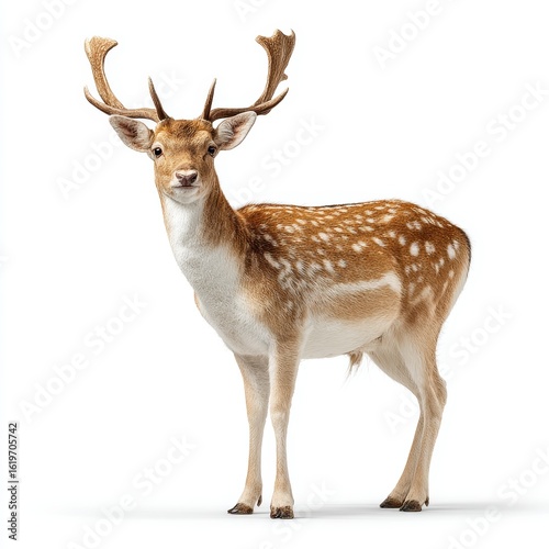 A majestic deer standing tall, showcasing its impressive antlers and spotted coat. The deer is a symbol of grace and beauty in the wild