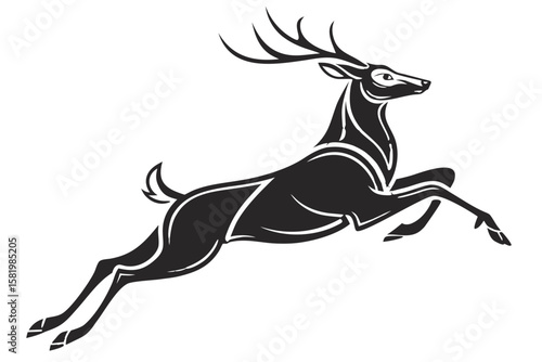 cervid, stag, buck, antler, animal, wildlife, forest, nature, jumping, running, silhouette, graphic, art, black, white, isolated, background, graceful, elegant, majestic, powerful, creature, mammal, hoof, mane, tail, leap