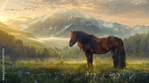 A majestic draft horse standing proudly in an enchanted mountain meadow, illuminated by golden sunlight and surrounded by nature’s beauty.