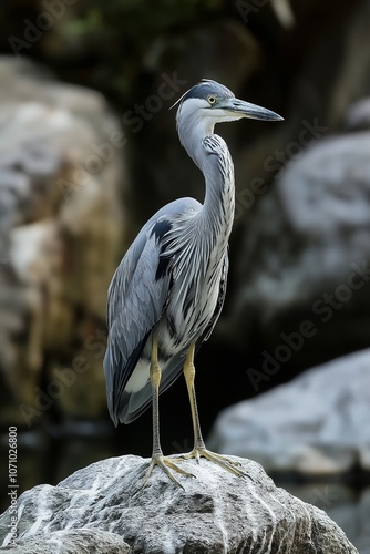 A majestic heron stands poised on a rock, set against a natural, rocky background showcasing its elegant features.