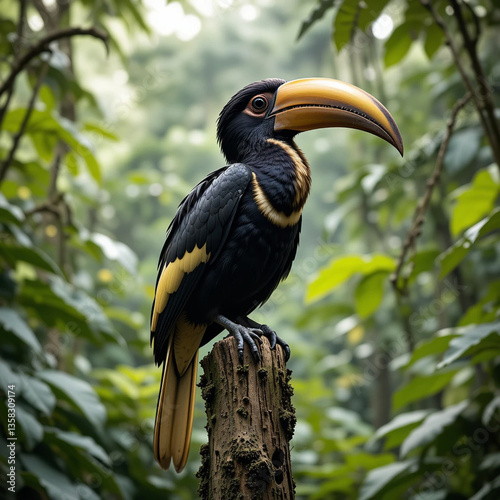 A majestic hornbill with a large, curved beak, sitting on a tall tree branch, surrounded by dense rainforest foliage.