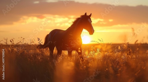 horse, sunset, summer, field, grass, gold, light, silhouette, warm, dramatic, picturesque, nature, animal, equine, landscape, sky, cloud, evening, horizon, rural, countryside, wildlife, beauty, calmness, serenity, peaceful, freedom, wild, majestic, powerful, vibrant, colourful, art, outdoors, natural, shadow, contrast, hours