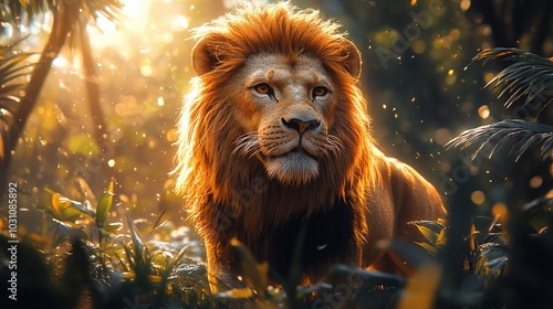 A majestic lion in a sunlit jungle, showcasing its regal presence amidst lush greenery.