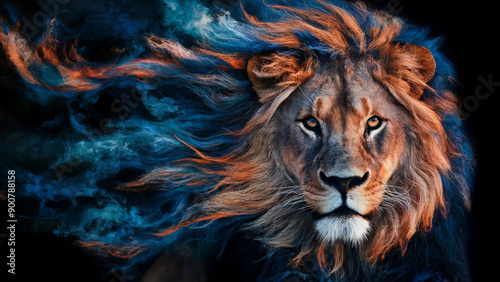 A majestic lion with a mane that appears to be in motion, swirling with vibrant hues of blue and orange.