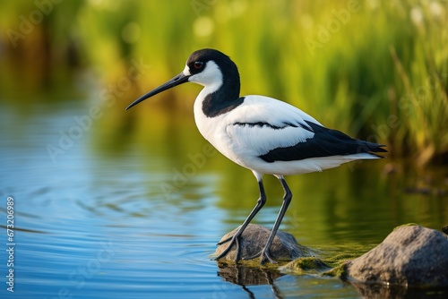 avocet, generative, ai, bird, black, white, standing, rock, water, monochrome, majestic, avian, perched, rocky, aquatic, outcrop