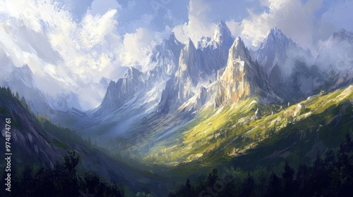 mountain, range, peak, peak, ridge, ridge, vale, shadow, sunlight, sun, sky, cloud, blue, white, green, forest, tree, nature, landscape, art, digital, painting, abstract, scenic, majestic, dramatic, contrast, light, dark, depth, perspective, aerial, vista, panoramic, serene, tranquil, awe, wonder