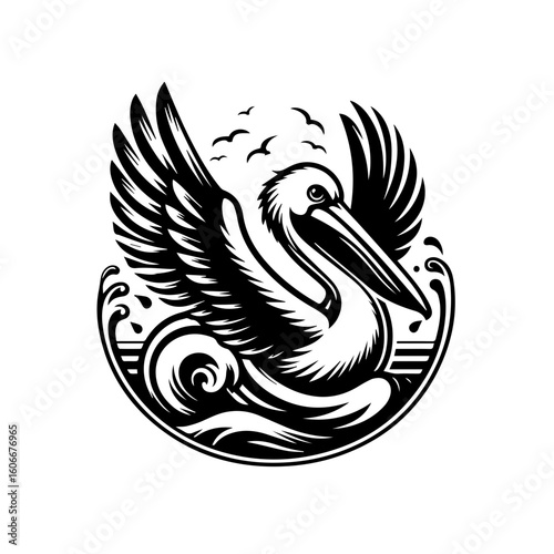 pelican, bird, sea, ocean, water, wave, animal, wildlife, coast, coastal, nature, drawing, graphic, symbol, logotype, design, art, black, white, isolated, silhouette, vintage, retro, tattoo, stencil, seabird, wing