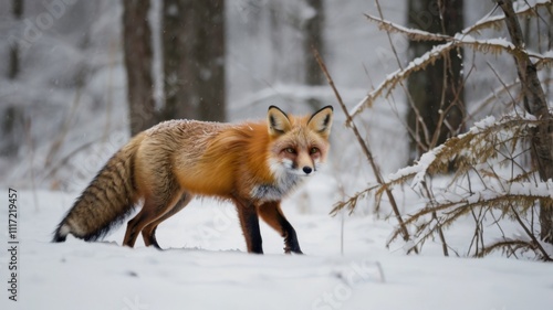 A majestic red fox stands alert in a snowy winter forest, its fur thick and warm against the falling snow. The fox's piercing eyes and bushy tail add to its captivating presence.