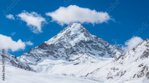 A majestic snowy mountain peak towers under a clear blue sky, surrounded by fluffy clouds, showcasing the beauty of nature.