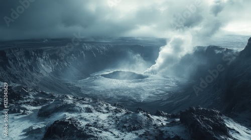 A majestic view of a volcanic crater surrounded by rugged terrain, steam rising into the air under a dramatic sky,