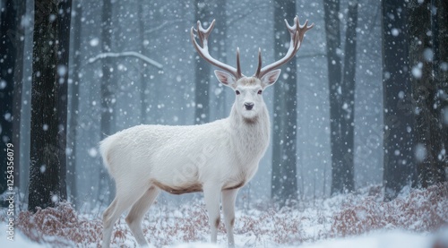 cervid, white deer, forest, snow, winter, wildlife, nature, tranquil, serene, snowflake, antler, timberland, peaceful, frost, beauty, animal, fauna, environment, outdoors, cold, landscape, stillness, tree, snow-covered, aethereal, magical, mystical, portrait