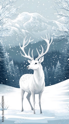 A majestic white deer with perfect antlers, and beautiful winter scenery