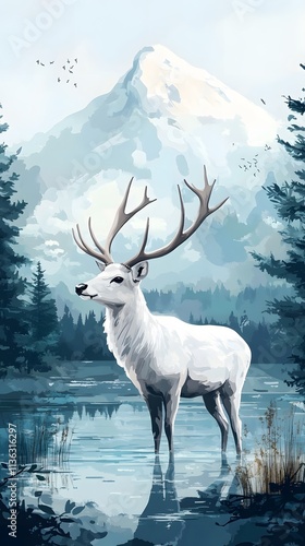 A majestic white deer with perfect antlers, with beautiful lake and mountain views