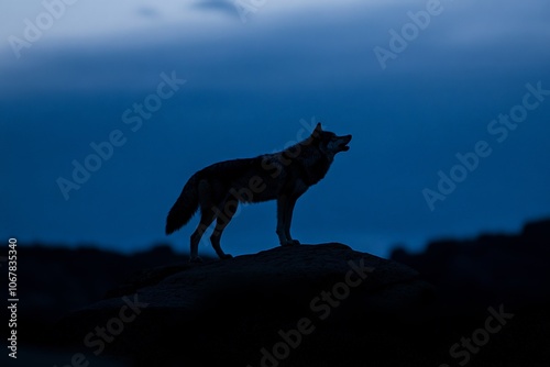 A majestic wolf stands on a rock, silhouetted against a deep blue, twilight sky, howling into the night, symbolizing wilderness and freedom in nature.