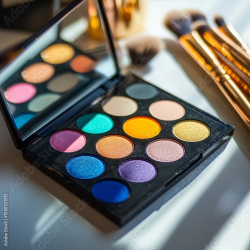 A makeup palette mockup with vibrant colors, resting on a glossy table with some makeup brushes beside it