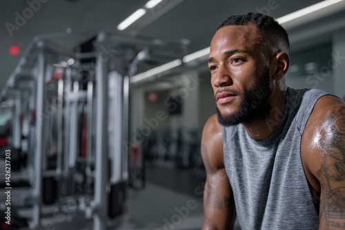 A male athlete pauses mid-training in a gym, capturing an introspective moment that showcases resilience, strength, and dedication within a modern fitness environment.