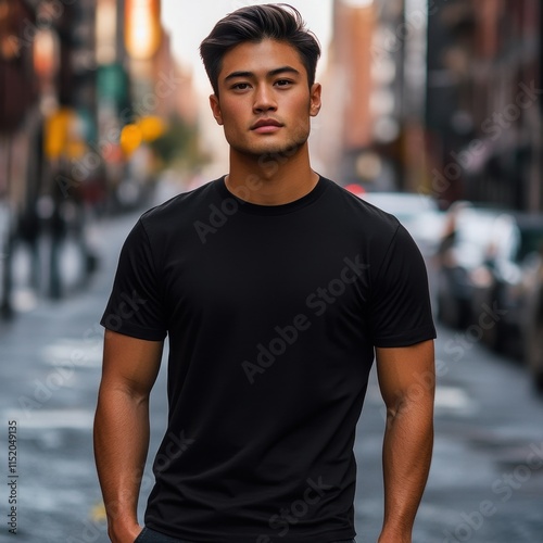 A male model wearing a black cotton t-shirt, posed casually on a city street.
