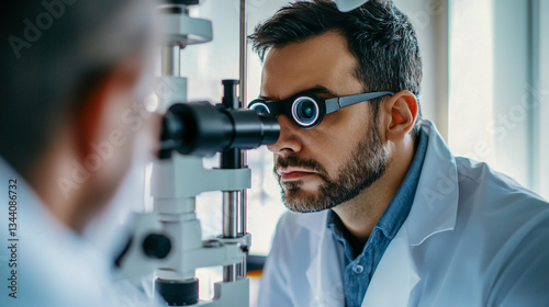 A male patient in his mid-40s is having his eyes examined by the doctor, sitting on a chair with his head resting against a machine