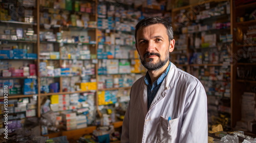 A male pharmacist in a white coat stands in a drugstore surrounded by shelves filled with medicines and health products.