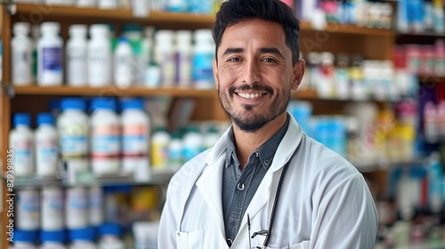 apothecary, male, smile, dark hair, facial hair, pharmacy, shelf, product, confident, professional, health care, medicine, customer service, expertise, trust, modern, contemporary, labcoat, background, prescription, medication, friendly, approachable, engaging, knowledgeable, photo, retail, interior, shop, business, portrait, cheerful, medicals, expression