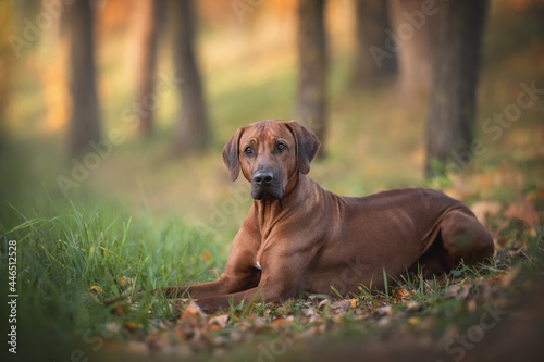 A male Rhodesian Ridgeback lying on the green grass against the background of a bright autumn landscape