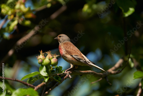 hemlock, fruit farm, apple tree, tree branch, apple, foliage, red, breast, plumage, closeup, apple orchard, morning, green, background, 1, only, beautiful, adorable, picturesque, landscape, male, songbird, europa, habitat, bird, ornithology, summer, blur, blurred background, copy space
