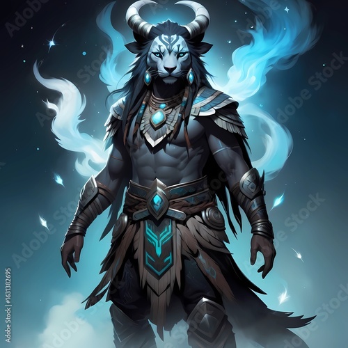 warrior, horn, tribal, glowing, blue, aura, moon, star, costume, spirit, indigenous, tradition, strength, celestial, ancient, sacred, power, magic, mythology, night sky, belief, mystic, moonlight, hero, enchanted, folklore, tribe, divine, protective, celestial bodies, legendary, courage, ancestral, knight, armoring, art, fantasy, war