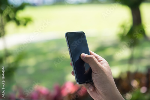 A male(man) hand hold(touch) and looking at smart phone in the