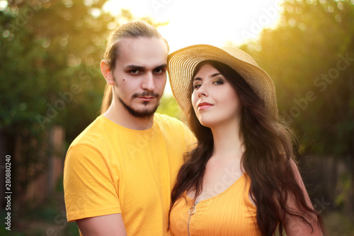 A man and a young woman in bright yellow clothes on a village street. A couple in love, summer, hot day, bright colors.