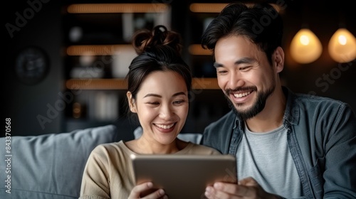 couple, man, woman, laughing, smiling, happy, entertainment, technology, home, couch, indoor, evening, night, light, cosy, relax, bonding, connection, love, human relationships, together, sharing, screen, content, joy, fun, amusement, lifestyle, modern, casual attire, comfortable, relaxed, living room, furniture, dark, dim, background, bookshelf