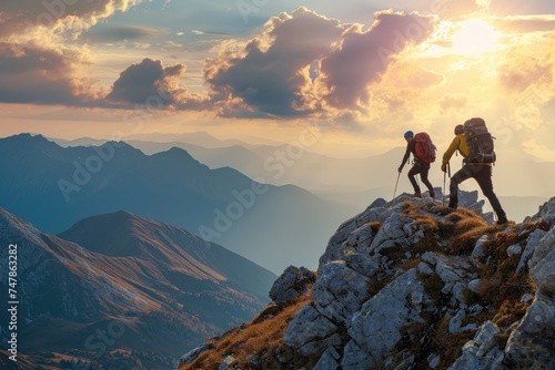 A Man and Woman Standing on a Snow-Covered Mountain Peak, Surrounded by Rocky Terrain, Two adventurers, one helping the other to reach the mountain crest, AI Generated