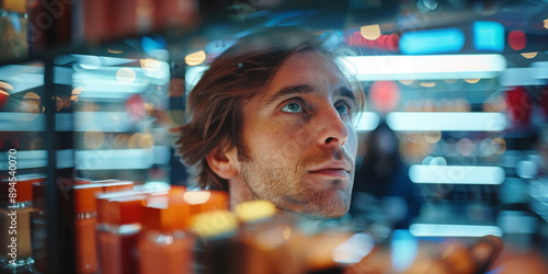 shopping, man, store, browsing, product, glasses, shelf, modern, consumer, retail, bright, illuminated, thoughtful, choosing, decision, sharpened, male, purchasing, urban, colourful, contemplation, looking, searching, display, item, client, lifestyle, market, indoor, buyer, good, consumerism, inside, merchandise, androgynous, wellness, equality