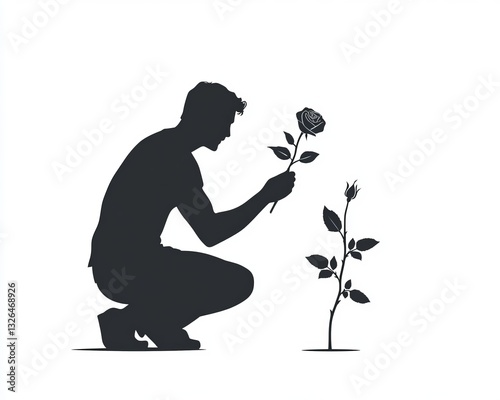 A Man Crouching Beside a Rose in a Simple Black and White Illustration