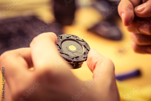 hand, watch, time, clock, dice, camera, lens, fix, man, hand, technology, photo, optical, plastic, metal, detail, closeup, macro, office, detail, aperture, shell, screw, table, inside, work, service, cable, careful, expert, cognition, skill, hold, light, shadow, open, part, small