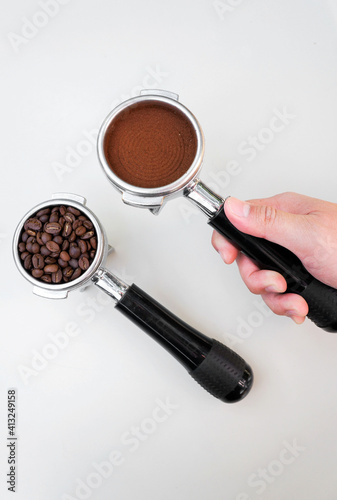 A man holding portafilter with coffee beans, a portafilter with ground coffee white plate on the table.