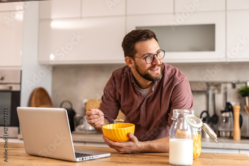 A man in a casual outfit enjoys his breakfast while working on his laptop in a modern kitchen. He starts his day with a nutritious meal, focusing on productivity and well-being.