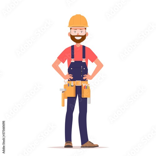 A man in a construction helmet and work clothes with tools. Handyman. Vector illustration
