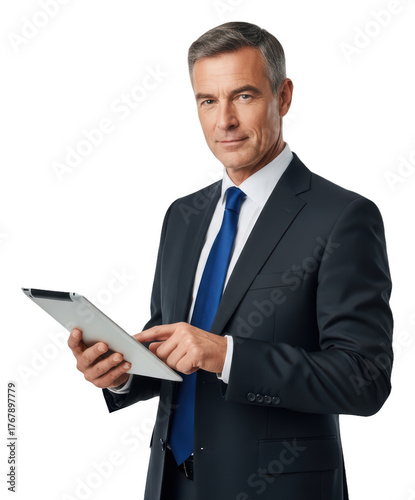 A man in a formal suit holding a tablet, against transparent background