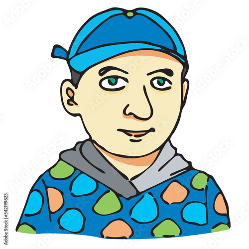 person, people, hat, boy, cartoon, cap, face, man, 1, guy, illustration, vector, smiling, happy, design, fashion, dot, jacket, clothes, ear, nose, eye, eyebrow, neck, smile, expression, colours, blue, green, line, cream, skin, hand-drawn, male, character, fantasy, imagination, bright