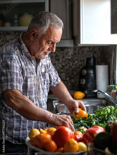 man, kitchen, fresh, produce, food, preparation, orange, vegetable, home, cooking, domestic, life, meal, fruit, market, scene, healthy, eating, counter, seller, slicing, table