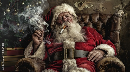 A man in a Santa suit smoking a cigarette. Suitable for Christmas themes