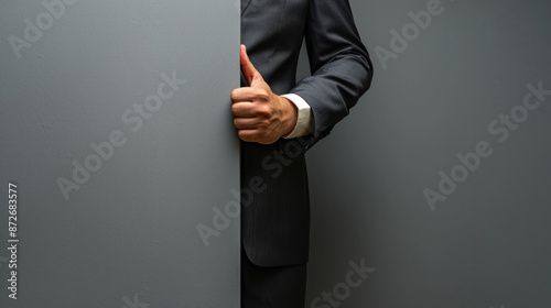 A man in a suit is giving a thumbs up while standing behind a white board. Concept of approval or satisfaction, as the man is expressing his positive opinion about something