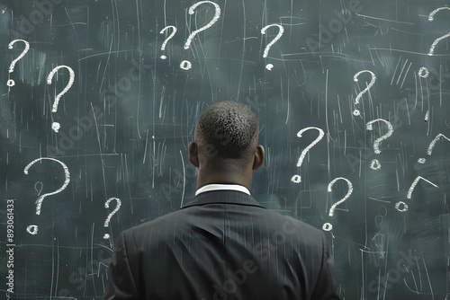 A man in a suit is looking at a chalkboard with many questions written on it. The man is deep in thought, possibly contemplating the answers to the questions or pondering a problem